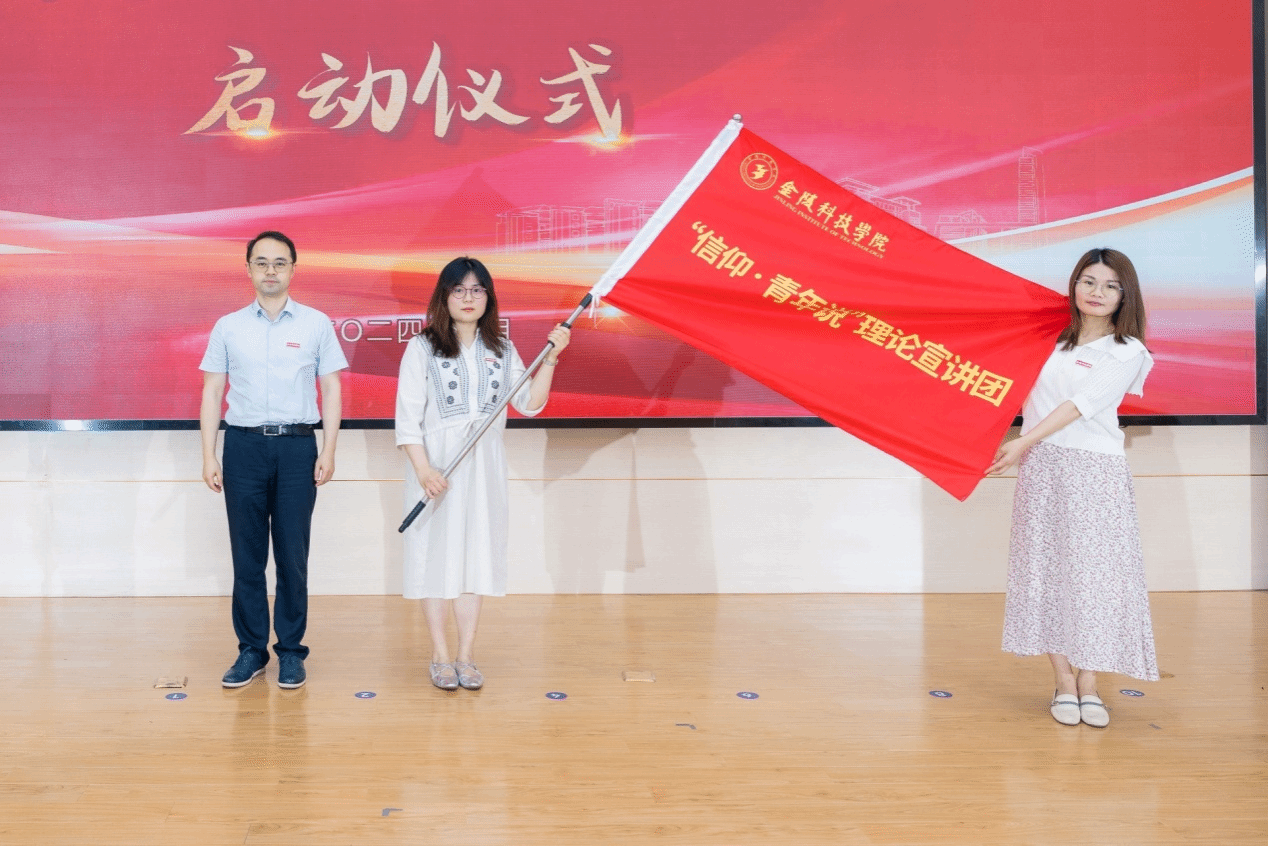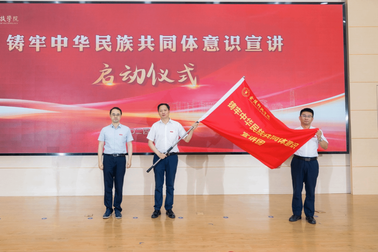 党委统战部部长黄洋代表党委统战部、校团委、马克思主义学院宣读了《关于成立金陵科技学院铸牢中华民族共同体意识宣讲团的通知》,党委宣传部部长赵越春代表党委宣传部、校团委、马克思主义学院宣读了《关于成立金陵科技学院“信仰·青年说”理论宣讲团的通知》,宣讲团成员由马克思主义学院骨干教师和铸牢中华民族共同体意识演讲比赛获奖学生组成。单晓峰向宣讲团授旗。