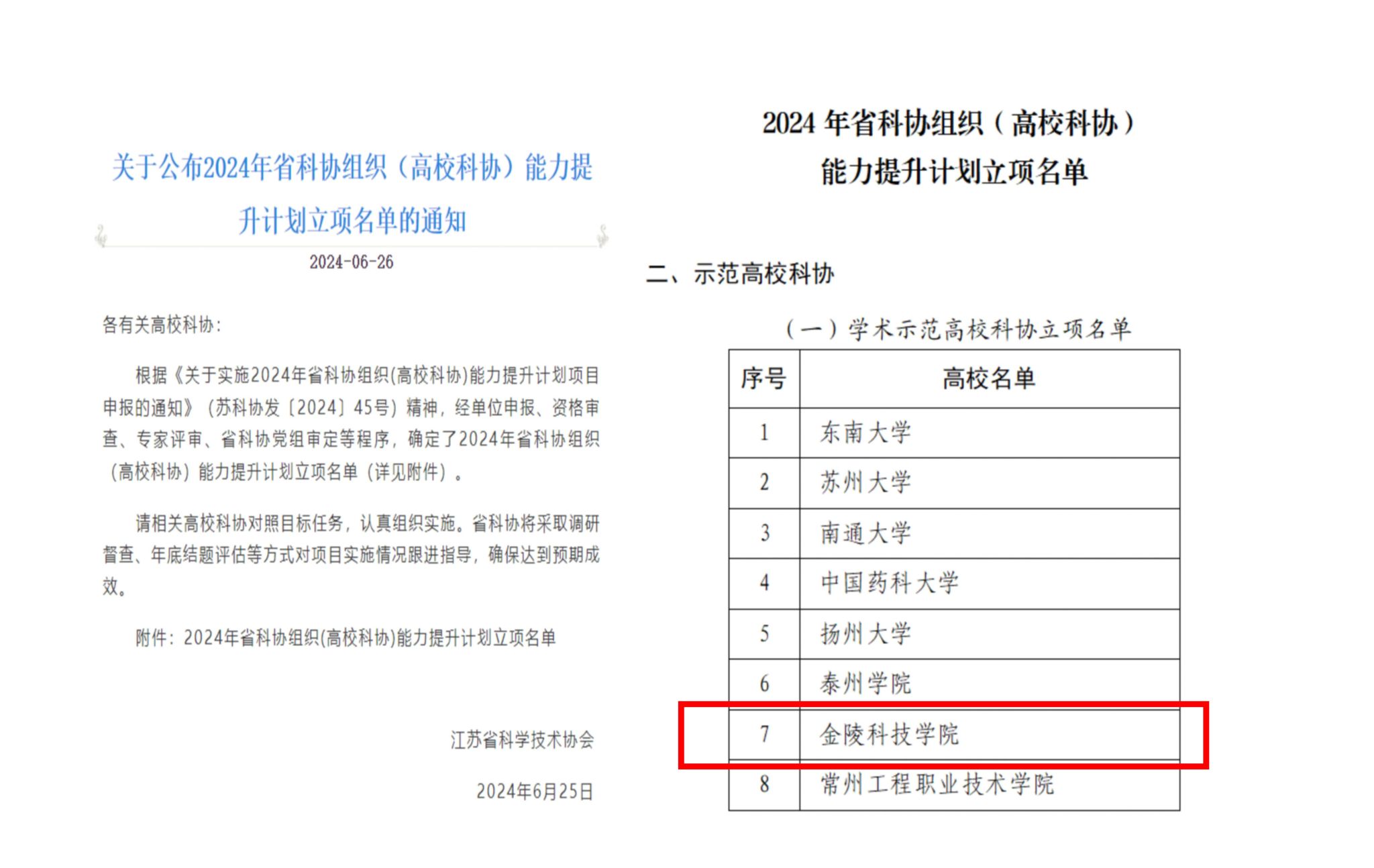 近日,江苏省科学技术协会公布了2024年省科协组织(高校科协)能力提升计划立项项目名单,我校科协与东南大学科协、苏州大学科协等8所高校科协并肩获得学术示范高校科协立项。