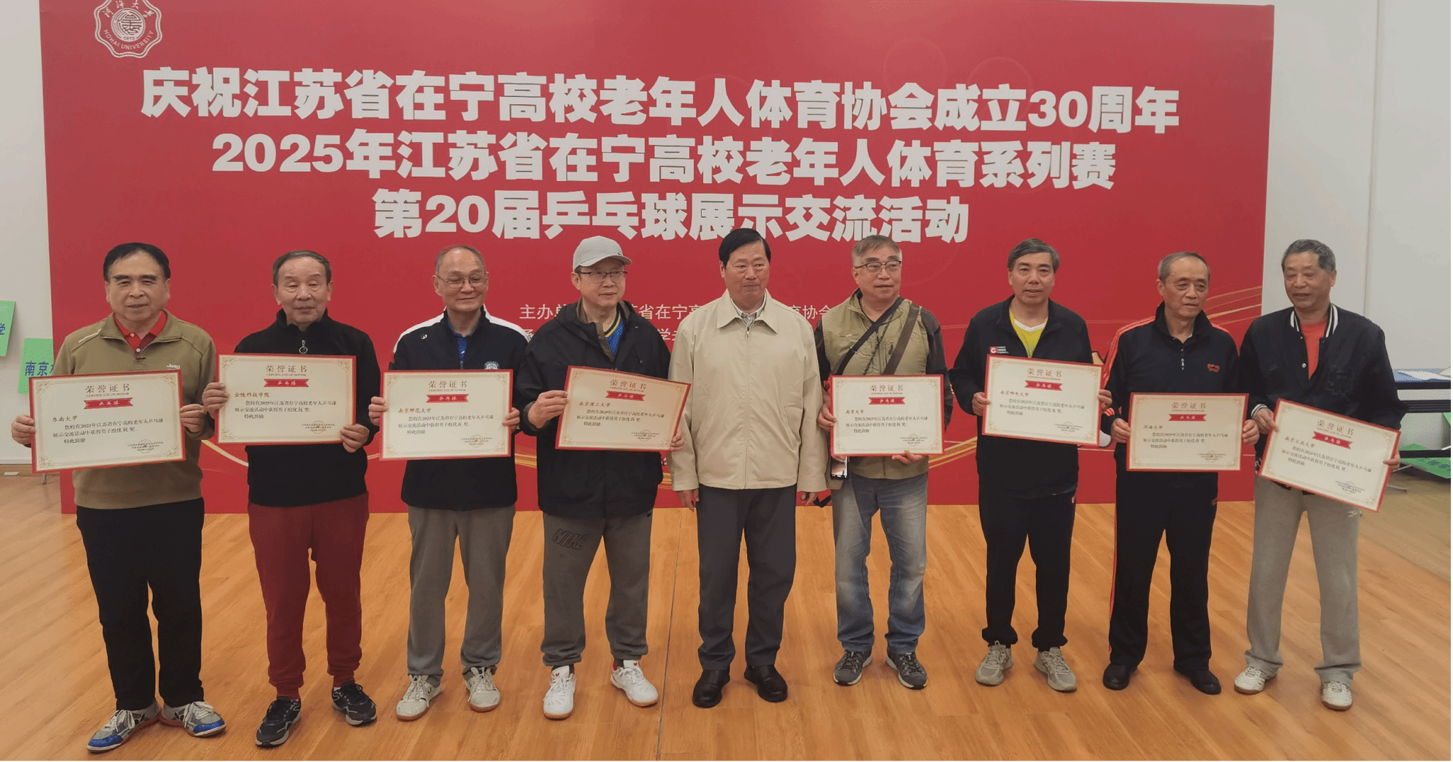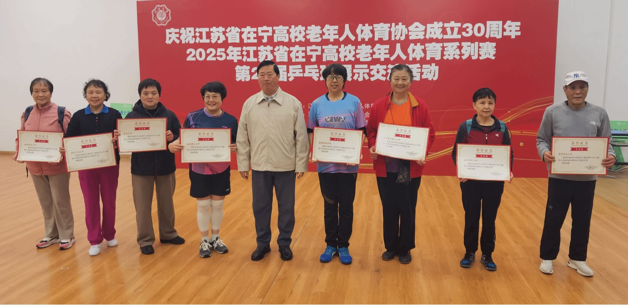 11月8日,2025年在宁高校第二十届老年人乒乓球展示交流活动在河海大学举行,22所在宁高校的老年人乒乓球队齐聚一堂,以球会友。经过前期比赛选拔、认真训练,现场协同配合、顽强拼搏,我校退教协带领老同志乒乓球队荣获女子团体亚军、男子团体第八名的好成绩。