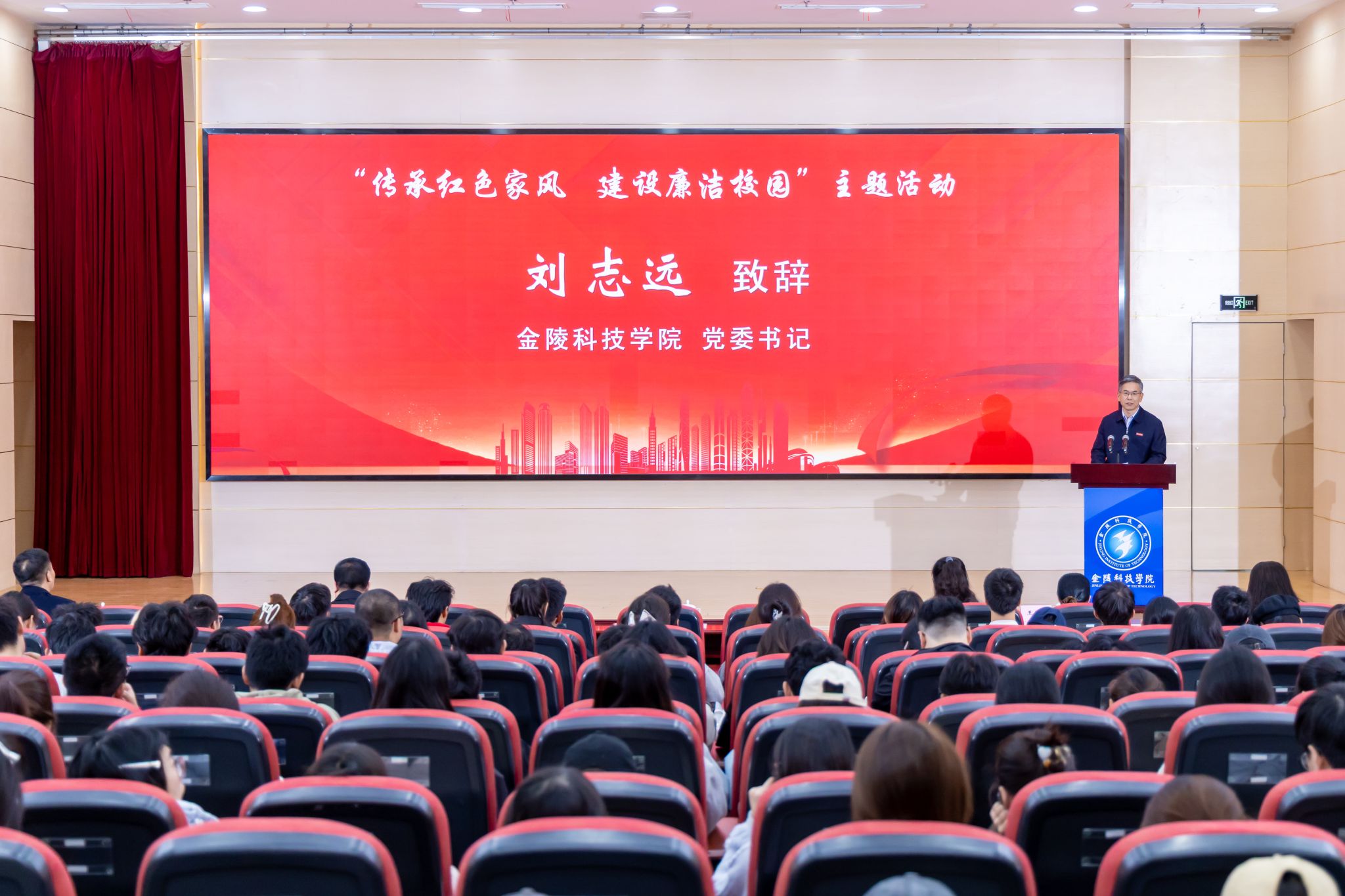主会场活动在科技楼报告厅举行,刘志远致辞。他指出,本次与周恩来故居管理处、中共代表团梅园新村纪念馆开展“红色文化育人实践基地”共建,是学校推进“传承红色家风 建设廉洁校园”主题活动的重要举措,也是我校落实立德树人根本任务、创新思想政治教育模式的积极探索。他强调,周恩来的红色家风和崇高风范是中华民族的宝贵精神财富,对于加强校园廉洁文化建设、引导师生树立正确的价值观具有深远意义。学校将依托两所纪念馆所承载的丰富史料,开展形式多样的红色教育活动,将红色故事转化为“鲜活课堂”,紧扣立德树人根本任务,持续提升思政教育的引领力和渗透力。他希望,三方合作能够以基地建设为纽带,通过师生走进纪念馆、馆内专家进校园、开发红色校本课程等一系列活动,让红色文化深度融入校园生活。最后,刘志远希望全体师生珍视此次学习机会,自觉从伟人的精神风范中汲取奋进力量,将红色基因内化于心、外化于行,共同传承和弘扬廉洁文化。