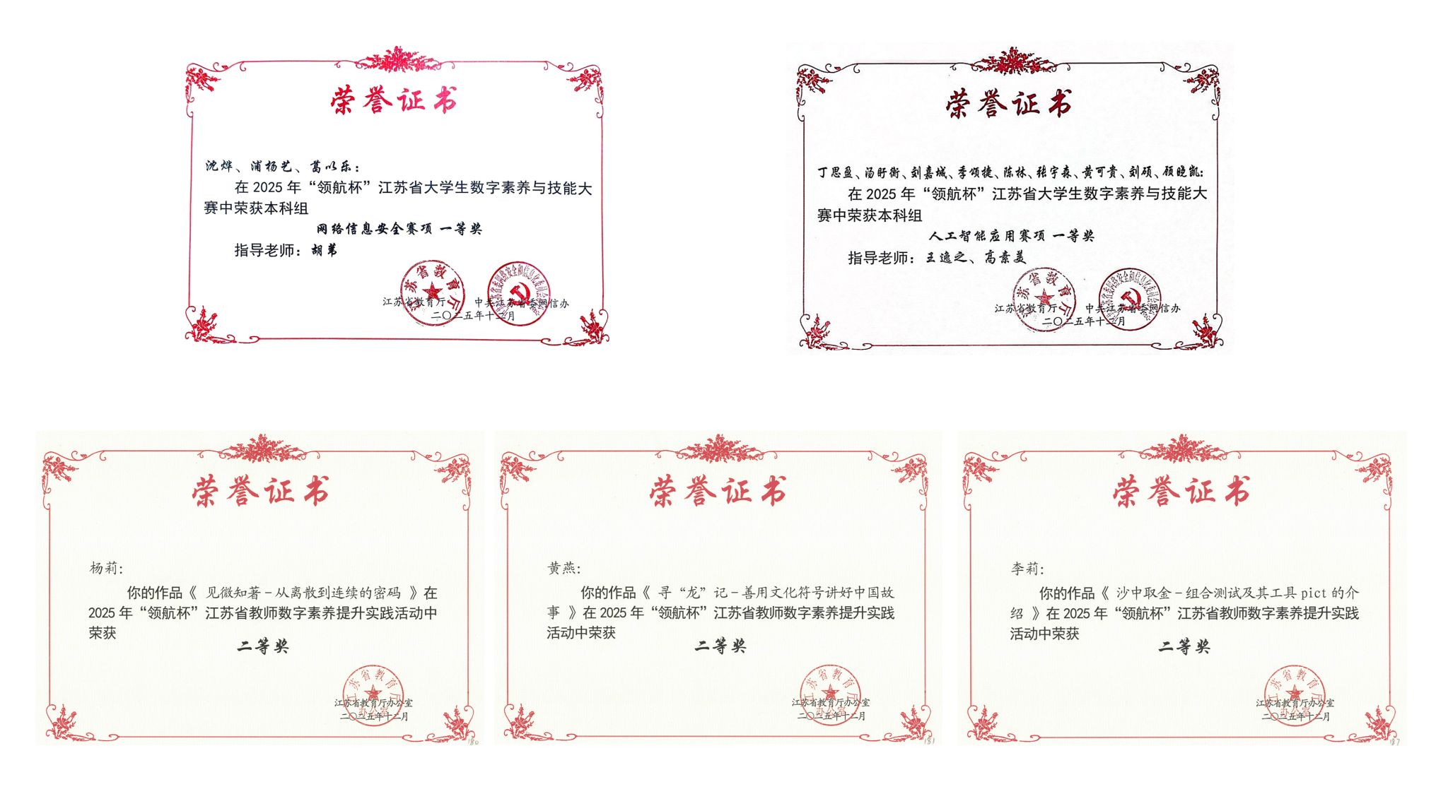 近日,在由江苏省教育厅、中共江苏省委网络安全和信息化委员会办公室联合主办的2025年“领航杯”多项大赛中,我校师生表现优异,荣获一等奖2项、二等奖3项。其中,在江苏省大学生数字素养与技能大赛网络信息安全赛项中,胡苇老师指导的学生团队荣获本科组一等奖;在江苏省大学生数字素养与技能大赛人工智能应用赛项中,王逸之、高素美老师指导的学生团队荣获本科组一等奖;在江苏省教师数字素养提升实践活动中,杨莉、黄燕、李莉等老师作品分别荣获二等奖各1项,充分展现了学校师生在数字素养与技能人才培养领域的扎实成效。