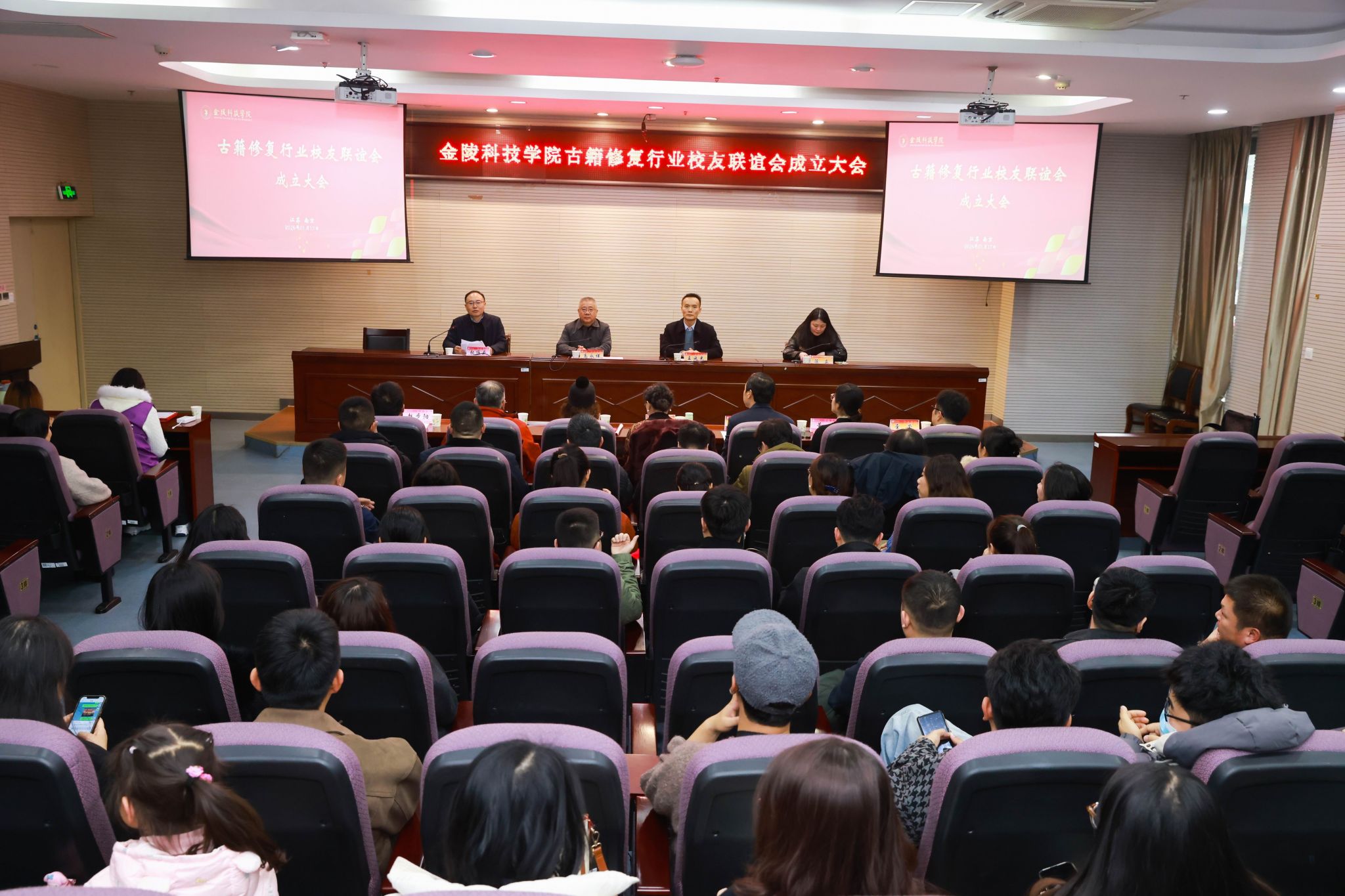 1月17日下午,我校在幕府校区图书馆报告厅举办首个行业性校友组织——古籍修复行业校友联谊会成立大会。副校长高永祥、副校长王延光出席活动。南京图书馆副馆长陈立,南京图书馆原古籍修复大师、校特聘教师周苏阳,南京博物院原书画修复大师、校特聘教师栾承素等嘉宾应邀出席。校友工作办公室负责人、人文学院班子成员及古籍修复专业校友代表、在校师生代表参加活动。成立大会由人文学院院长张维亚主持。