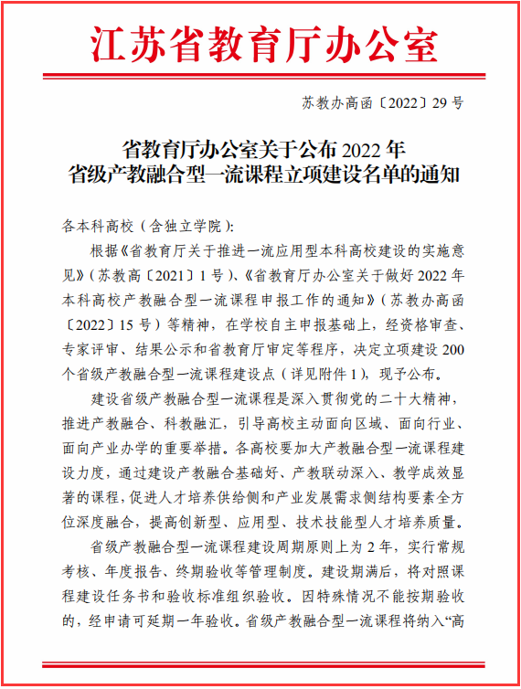 近日,江苏省教育厅发布了《关于公布2022年省级产教融合型一流课程立项建设名单的通知》(苏教办高函〔2022〕29号),我校《动画场景设计》《机械CAD/CAM软件应用》《建筑消防系统》3门课程获批立项。