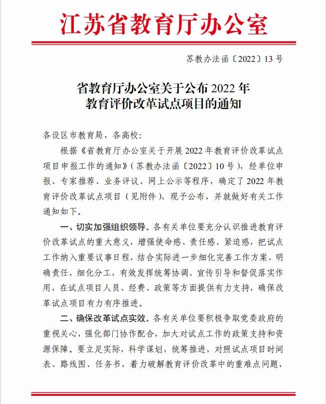 近日,江苏省教育厅发布《省教育厅办公室关于公布2022 年教育评价改革试点项目的通知》(苏教办法函〔2022〕13号),我校申报的《新时代德智体美劳应用型人才培养多元评价改革》获批立项。本次教育评价改革试点项目共计立项96项,其中设区市试点项目38项、高校试点项目58项。