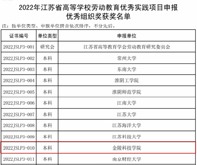 根据《关于公布2022年江苏省高等学校劳动教育优秀实践项目评选结果的通知》(苏高教会﹝2023﹞5号)文件,我校择优报送的4个项目全部获奖,其中特等奖1个、一等奖2个、二等奖1个。由于项目评选组织规范、成绩优异,学校同时被授予“优秀组织奖”。