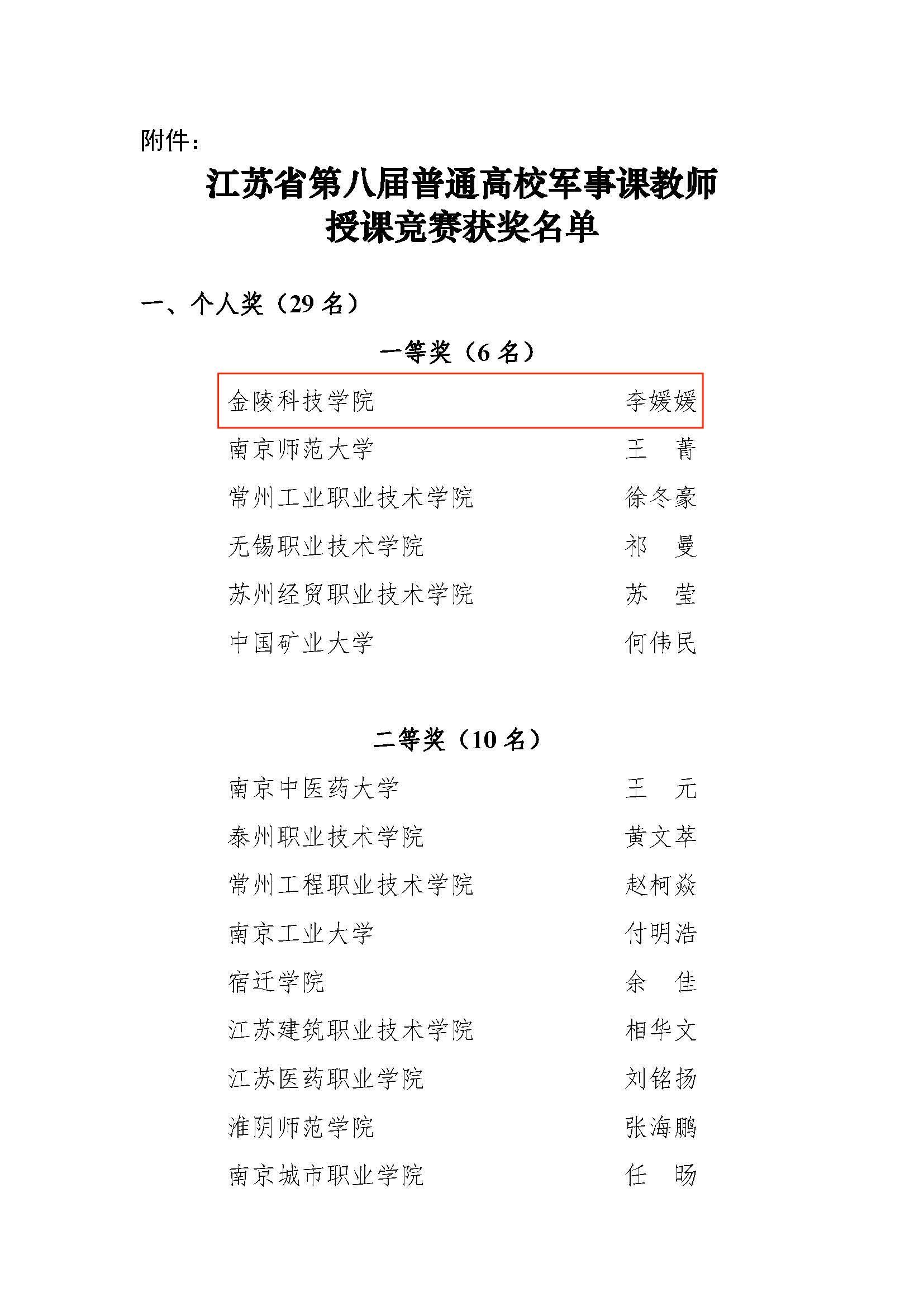 日前,江苏省普通高等学校军事课教学指导委员会公布了江苏省第八届普通高校军事课教师授课竞赛结果,我校人武部军事课教师李媛媛获一等奖。