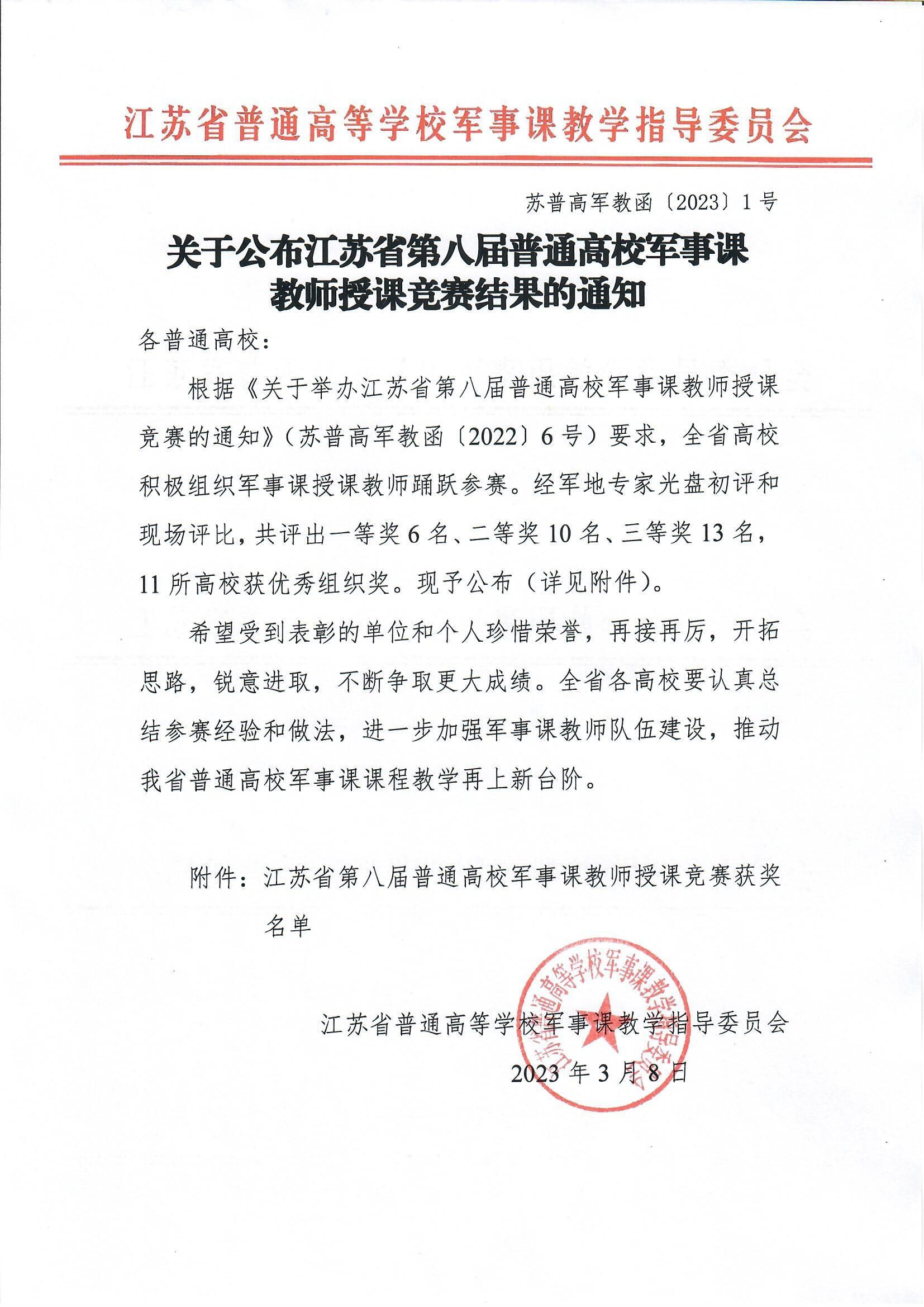 近年来,我校军事课教师在省部级军事课教学比赛中屡获佳绩,包括江苏省普通高等学校军事课教师授课竞赛一等奖两次,三等级两次;江苏省普通高等学校军事课教师微课教学竞赛一等奖一次、二等奖一次;教育部军事课教学展示三等级一次。